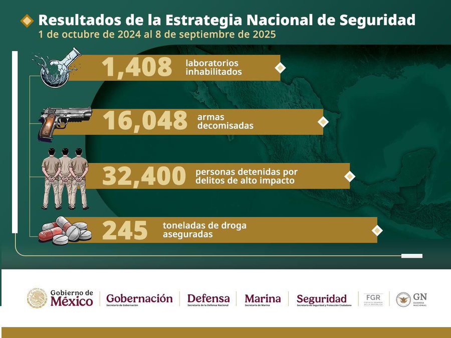 Además el titular de la SSPC comentó que los trabajos en materia de seguridad se han podido llevar a cabo gracias a la coordinación entre la Secretaría de la Defensa Nacional (Defensa), Marina, Guardia Nacional, Fiscalía General de la República y gobiernos estatales, quienes en conjunto han permitido la desarticulación de redes criminales y la afectación de estructuras financieras.